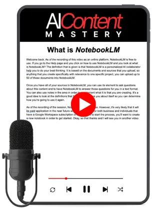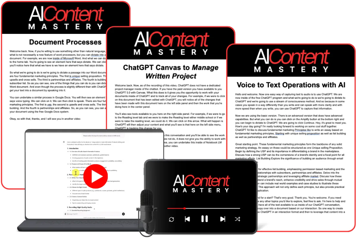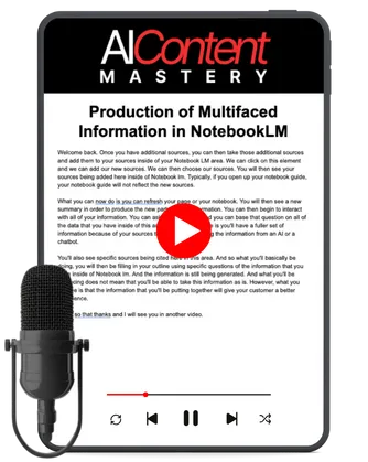 AI Content Creation Masterclass: Complete step-by-step training showing you how to create information products that are unique and informative using AI tools like ChatGPT, NotebookLM, and advanced research systems.