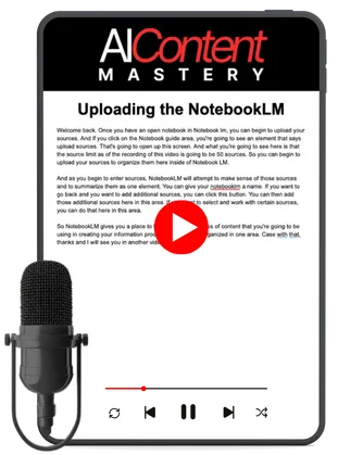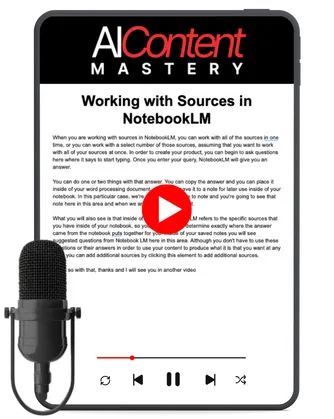 NotebookLM Mastery System: How to upload up to 50 sources (500,000 words each), organize your research, and use NotebookLM to generate comprehensive content and even audio summaries in podcast format.